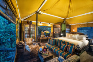 Shinta Mani Wild, nella giungla dei Monti Cardamomo, è un campo tendato immerso in 400 ettari di foresta minacciata. Con i proventi delle sue opere d’arte, Bensley finanzia 14 ranger che pattugliano l’area notte e giorno.