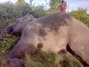 Il corpo dell’elefante riverso in un campo, tra fili caduti e terra bruciata.